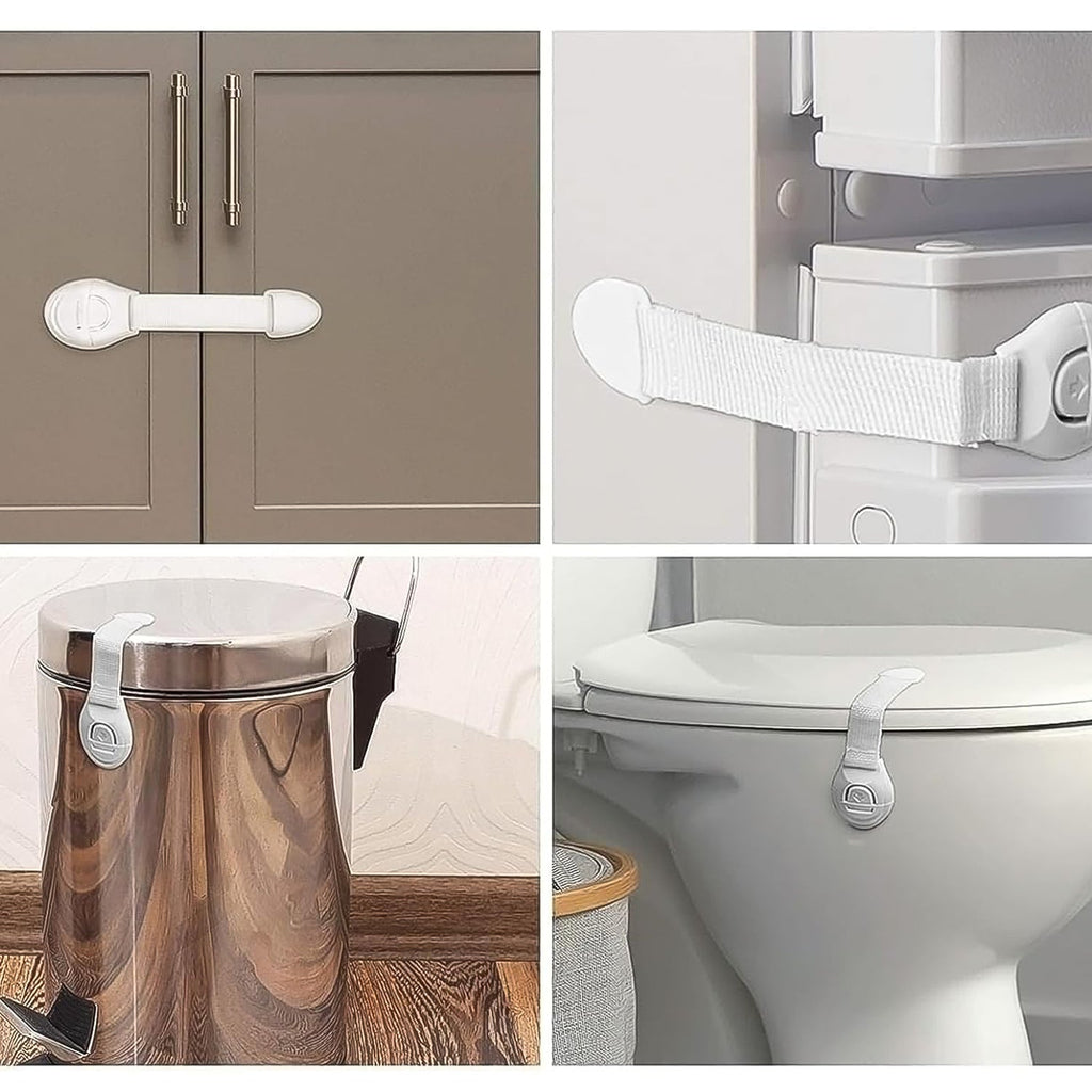 - Child safety strap locks are made of high-quality ABS plastic, and the strap can bear high tension force. Adhesive will hold toughly and does no damage to any furniture surface. Easy to remove later.