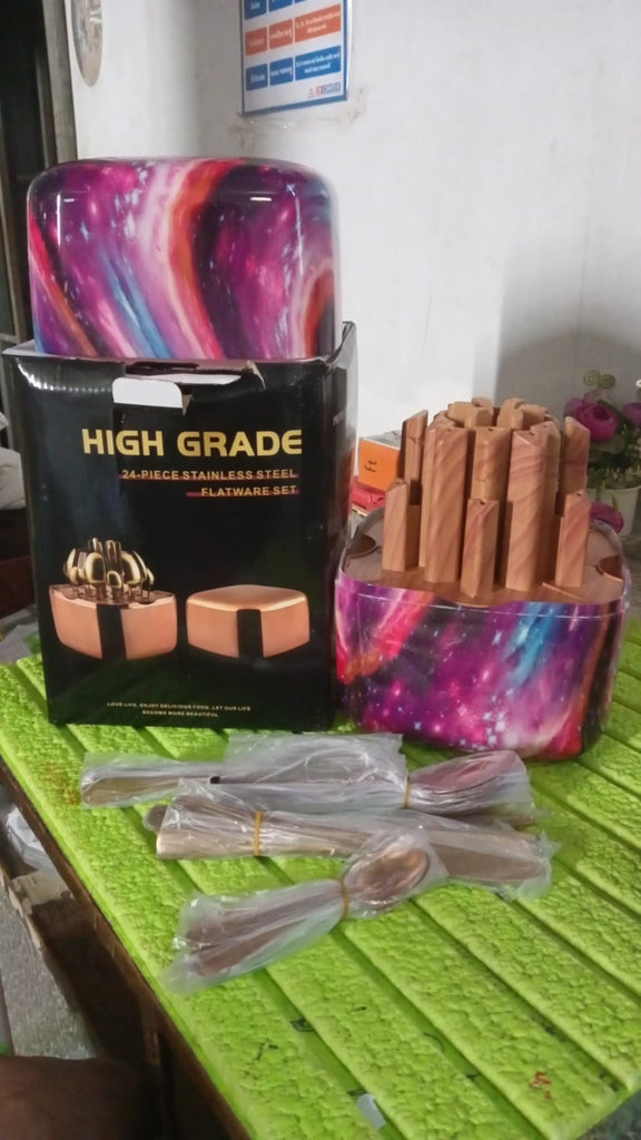 5593 Unique Golden Egg Storage Modern Tableware Steak Knives Fork Flatware Set Royal Spoon Set Tableware Gold Cutlery Set Dishwasher Safe Mirror Finished With Gift Box for Halloween 24Pcs Set
